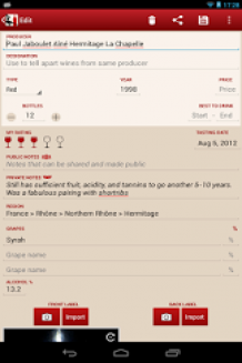 Belle application! par anonymePetit bémol cependant, ne pas pouvoir déplacer l'installation sur la carte SD (HTC Desire). Une fonction lecture barcode serait aussi sympa pour intégrer les vins plus rapidement! Merci en tout cas!