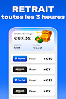 par anonymeVraiment une arnaque, comme toutes les applications dans le genre .. les premières heures de jeux on gagne facilement quelques centimes, plus si on a pas de vie et qu'on joue plus qu'un geek sur sa console. j'ai testé 2, 3 petit retrait pour voir si je recevais les sous sur PayPal, effectivement j'ai reçu. maintenant pour retirer ça me demande un scan facial pour vérifier que je ne suis pas un robot, ok.. mais le scan ne se fait jamais, avec ou sans lumière, peu importe ça ne fonctionne plus..